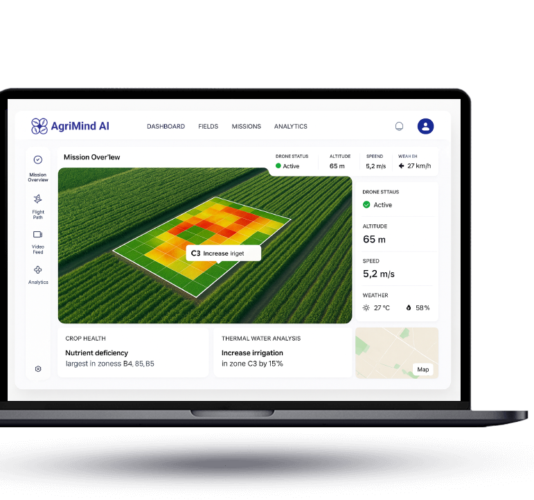 AgriMind AI is a smart drone platform for precision farming. Using AI, real-time insights, and automated actions, we help farms boost yields, save resources, and stay ahead.